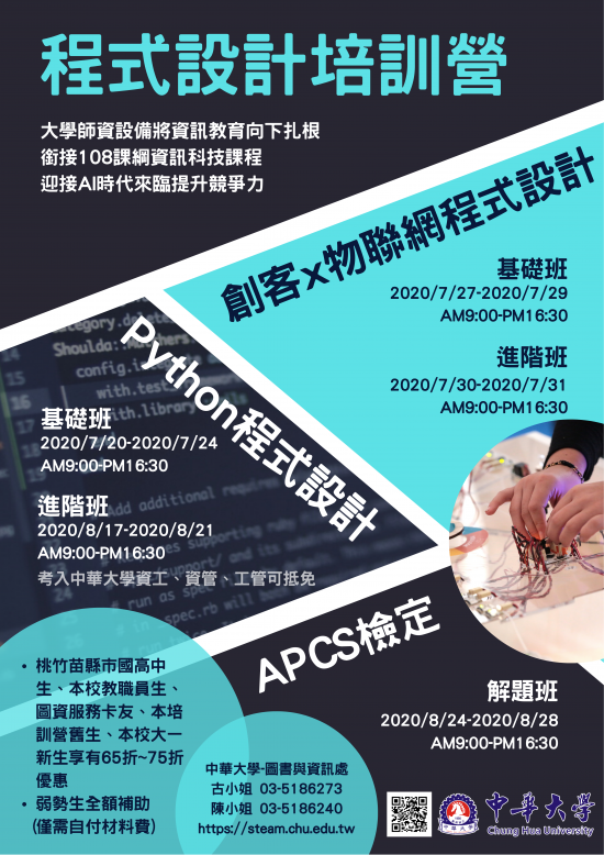 六、課程詳情請參考培訓營網站:https://steam.chu.edu.tw/