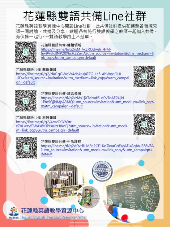 一、 為協助學校推動雙語教學,英語教學資源中心辦理跨校雙語教學共備社群,歡迎各校雙語教師加入,並於群組裡交流討論及分享雙語教學。有意願加入之教師請詳見附件(海報)上Qrcode,加入line群後有專人進行後續社群運作說明及討論。