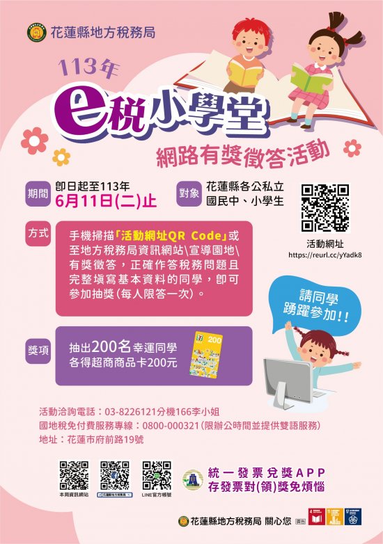 為建立正確租稅知識與普及租稅教育,即日起至本(113)年6月11日(星期二)止舉辦國中小學生「e稅小學堂」網路有獎徵答活動,鼓勵學生踴躍參與!