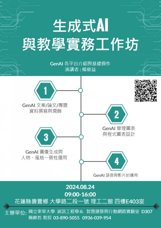 國立東華大學舉辦113年精進特色師培計畫—「生成式AI與教學實務工作坊-MadewithDesignCap」,敬邀花東地區中小學教師報名參加。