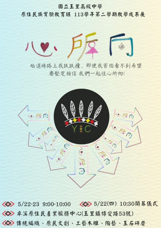有關國立玉里高級中學於本鄉原住民產業服務中心2樓辦理「原住民族實驗教育班113學年度第二學期教學成果展」,敬請協助宣導並踴躍參加,請查照。